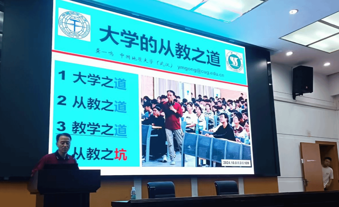 16日上午9点在地学楼二楼学术报告厅,龚一鸣教授为我院全体教师作以“大学的从教之道”为主题的教学能力提升学术报告,学院党委书记张国栋教授主持,全院教师参会交流。龚一鸣教授从“大学之道、从教之道、教学之道、从教之坑”四个方面系统深入阐明了大学从教之道的内涵和本质。龚一鸣教师从“为何教”和“怎么教”引出教学之道,强调大学教师探索“如何引导学生发现真理”的重要性;并分享了“课以四教”课堂教授法,同时,希望青年教师们不仅要做好教学,更要培养自己的人格魅力,做一个有情怀、有胸怀、有气质的高校教师。龚一鸣教授的报告引发了参会师生的强烈共鸣,教师们受益匪浅,部分教师针对教学过程中遇到的困惑和教育改革等问题与龚一鸣教授进行了讨论和交流。