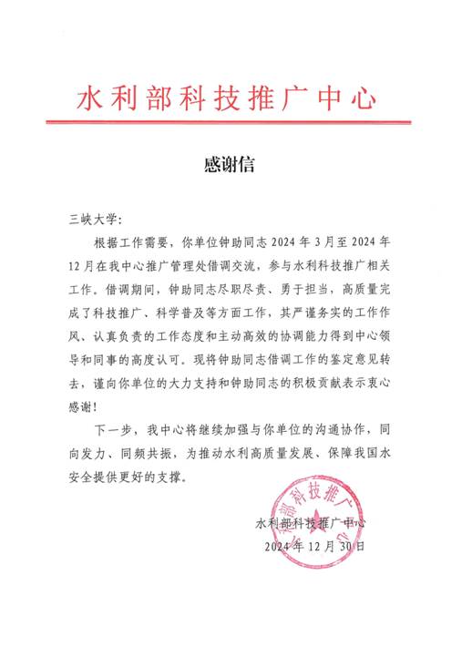 (通讯员 徐理 刘大翔)近日,我院收到了来自水利部科技推广中心的感谢信,对我院钟助副教授在该中心借调期间的工作表现、优良作风给予了高度评价。