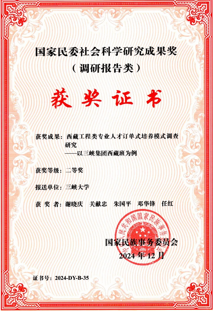 此次评选共评出2023年度全国民族工作优秀调研报告260篇,其中一等奖25篇,二等奖50篇,三等奖80篇,优秀奖105篇,并颁发“国家民委社会科学研究成果奖(调研报告类)”获奖证书。谢晓庆研究团队调研报告以铸牢中华民族共同体意识为主线,聚焦政府、企业、高校三方合作为西藏培养工程类专业人才的模式创新,以三峡集团西藏班为研究对象,通过问卷调查、访谈、实地走访等方式开展调查研究,深入研究了政府政策、企业需求、高校优势在订单式人才培养中的有效实现形式,是工程教育赋能民族地区发展的生动诠释,为进一步推动高校人才培养模式改革提供了借鉴。
