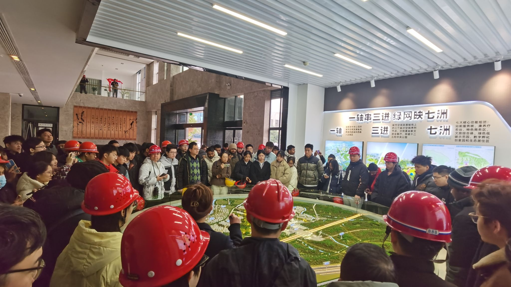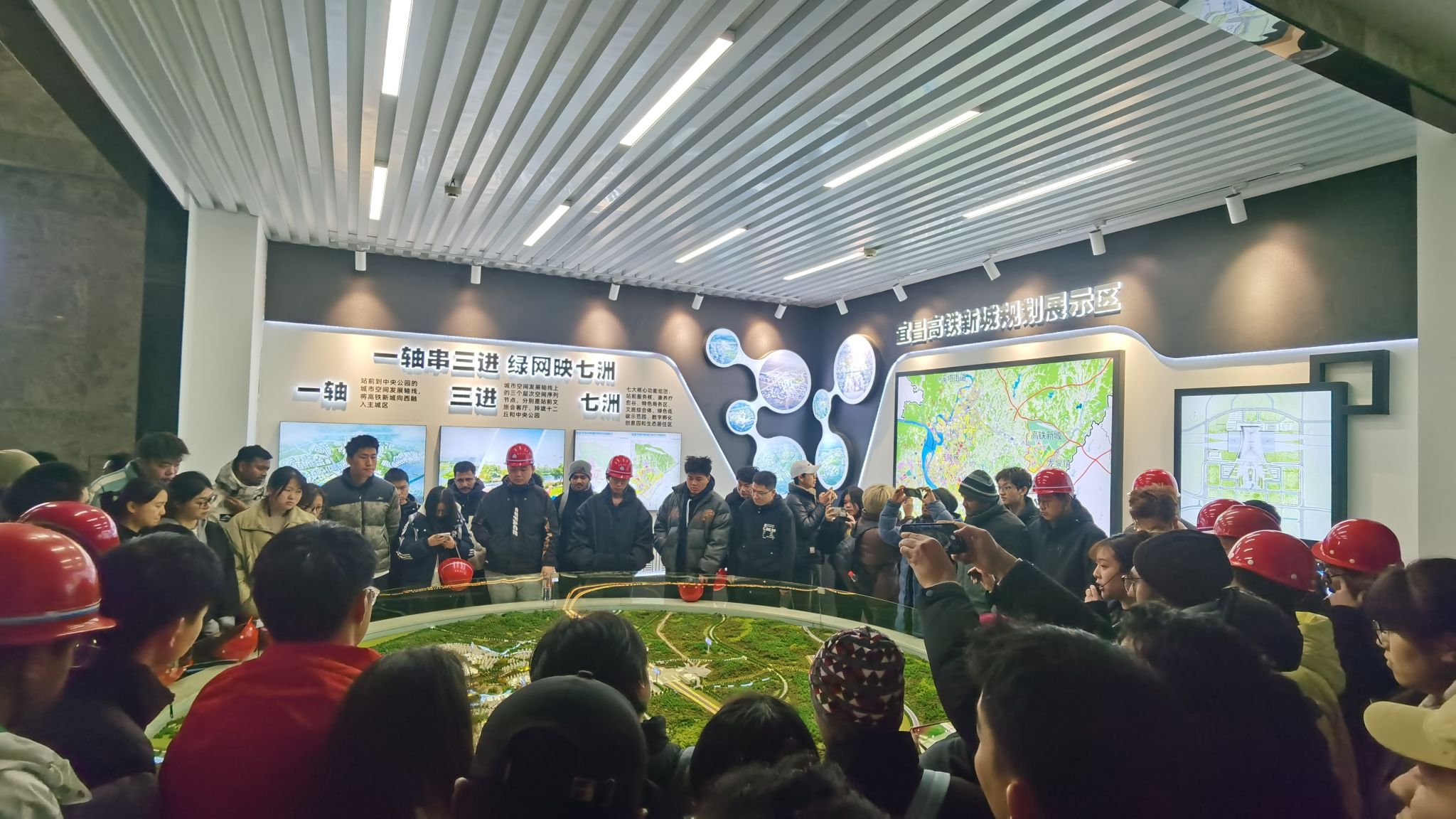 实习伊始,学生们来到项目公司。工作人员借助实体沙盘,详细介绍了高铁新城的总体规划、园区布局和局部建设进展,学生们从中深切体会到 “山水融城”“一轴串三进,绿网映七洲” 的创新发展理念。