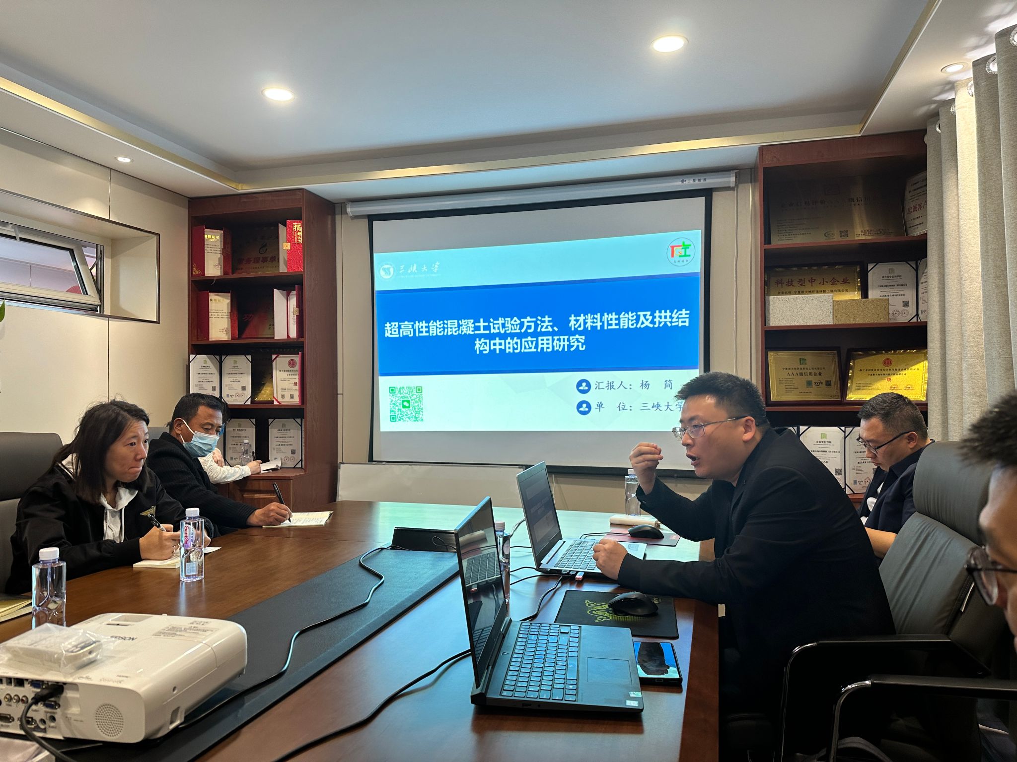 志砼道合团队充分利用本次会议契机,会后受邀前往宁夏新大地环保科技有限公司和宁夏大学就高性能混凝土和固废资源化利用进行学术交流。2025年4月14日,受邀前往宁夏回族自治区银川市固废资源化处理龙头企业宁夏新大地环保科技有限公司进行交流。杨简老师受邀为参会的盐池县组织部同志、企业代表和技术骨干进行题为《超高性能混凝土试验方法、材料性能及拱结构中的应用》的专题汇报,以介绍团队在超高性能混凝土和特种超高性能混凝土方面的研究成果。宁夏新大地环保科技有限公石奕煊总经理为团队各位老师详细介绍了公司堆场情况、宁夏地区的主要固废类型、处理技术和面临的问题。现场交流气氛热烈,双方面均表示要进一步加强技术合作。
