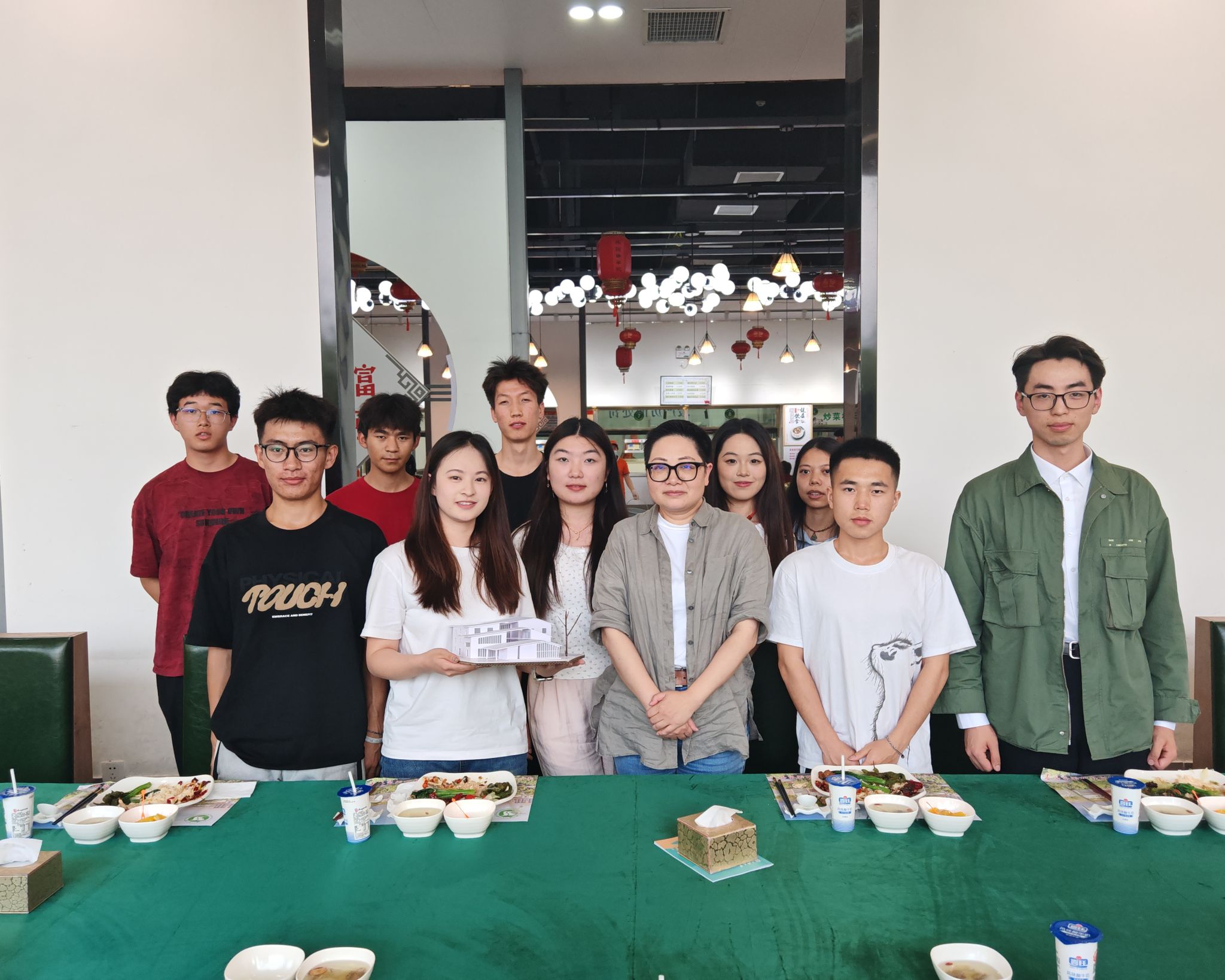 晚餐接近尾声时,土木与建筑学院建筑类专业学生代表向黄艳校长赠送了一份特殊的礼物 —— 同学们自主设计制作的农产品电商中心建筑模型。该模型以乡村振兴战略为背景,聚焦农产品流通场景,从功能分区到外观设计均融入地域文化元素。特别设置了冷链仓储区、直播带货区和农产品展示区,希望通过模型探索“建筑 + 产业”的乡村发展新路径。