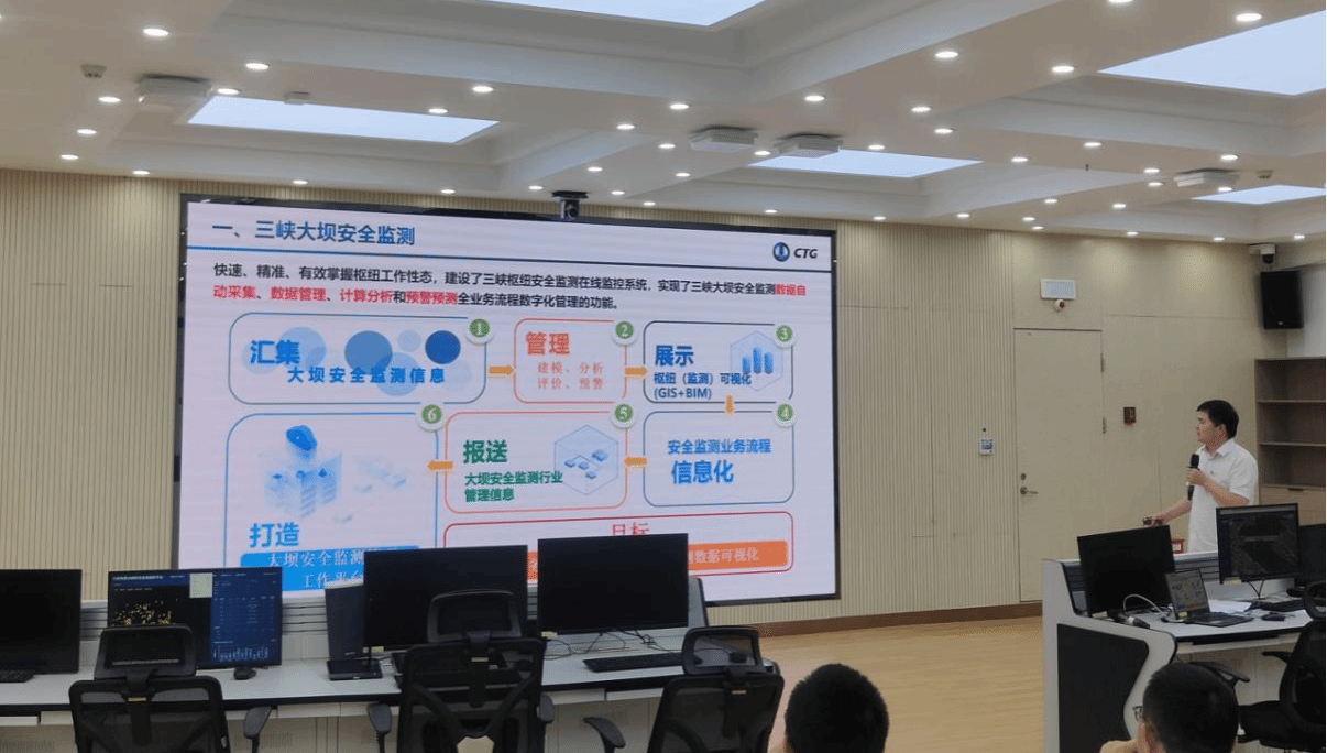 接着,监测中心党支部书记童广勤介绍了党支部党建和业务工作情况,监测中心党支部汇报了三峡工程安全监测工作,并演示三峡枢纽安全监测在线监控系统。土木与建筑学院执行院长邓华锋从历史沿革、学科体系、师资队伍、基地平台、办学条件、学科团队、科研项目、科研成果等方面详细介绍了土木与建筑学院的基本情况,地质工程系党支部书记刘艺梁介绍了党支部党建工作情况和三峡大学在高陡边坡稳定性分析与控制和地质灾害防治方面开展的特色工作。