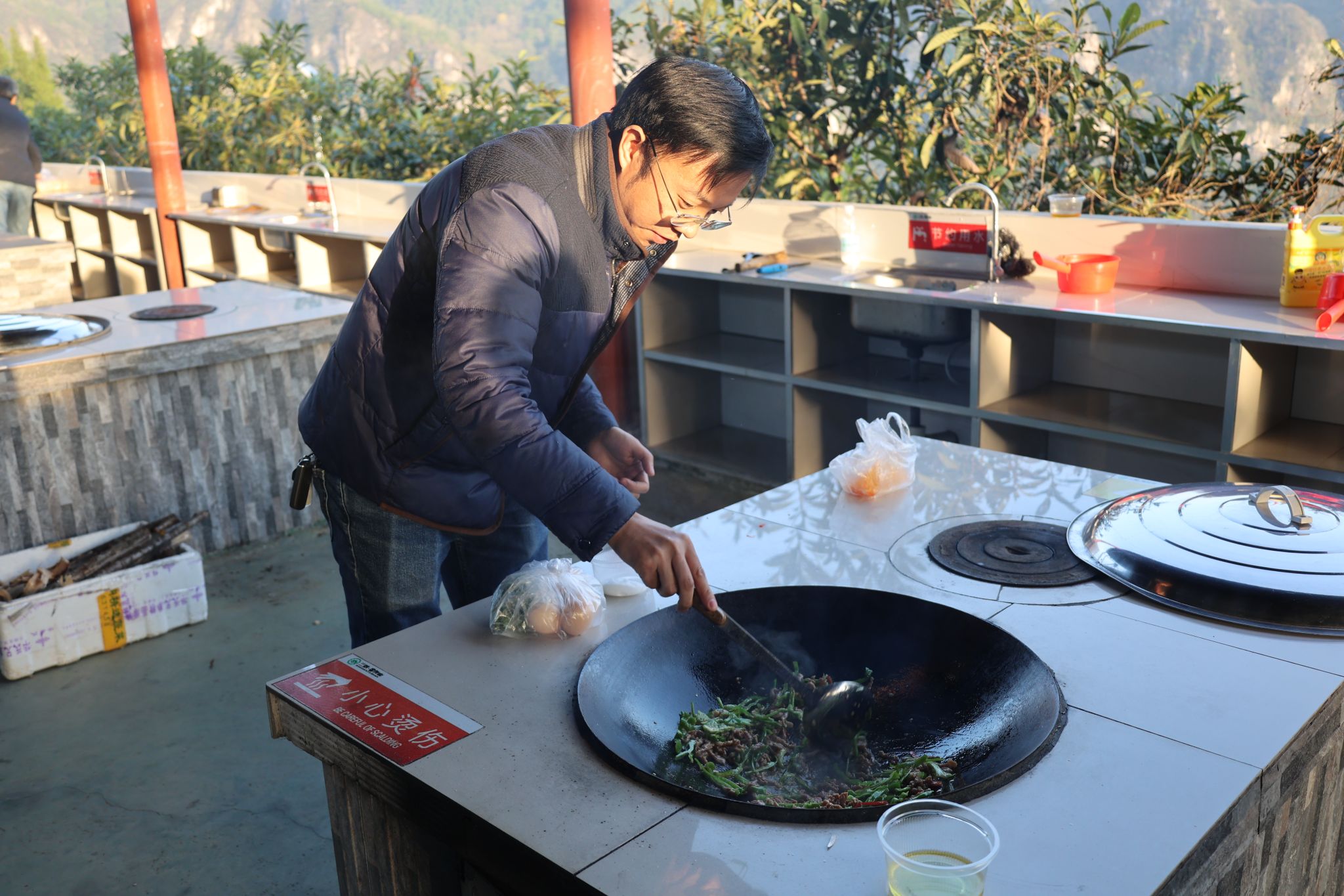 傍晚时分的晚餐环节,教职工们以10人一桌的形式分组就餐,每桌选派代表亲手烹饪小炒肉、韭菜鸡蛋等家常菜。大家一边品尝自己亲手制作的美食,一边畅谈工作与生活,气氛温馨而融洽,进一步拉近了彼此的距离。