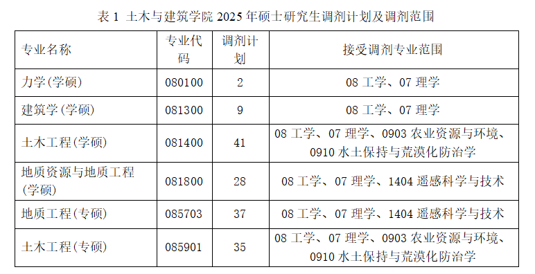 力学(学硕/080100)、土木工程(学硕/081400)、地质资源与地质工程(学硕/081800)、建筑学(学硕/081300)、地质工程(专硕/085703)、土木工程(专硕/085901)六个专业将与国家调剂系统同步,定于4月8日零时开放。