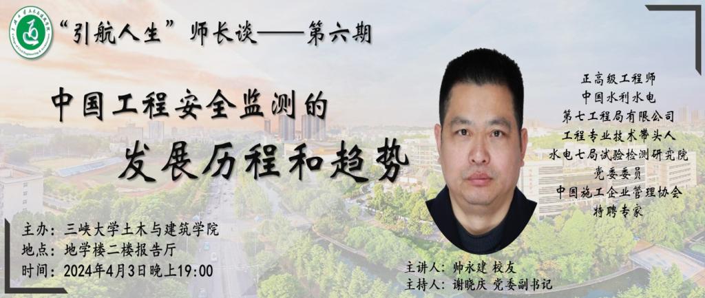 (通讯员 黄浩东)2024年4月3日晚上19:00,土木与建筑学院“引航人生”师长谈第六期讲座在地学楼报告厅举行。院方邀请到优秀校友帅永建师兄为我们开展本期讲座,学院党委副书记谢晓庆主持会议,2023级本科生及研究生参加讲座。