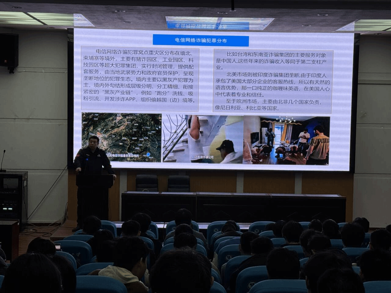 2022级辅导员杨创老师在会中强调安全防范是每个大学生都应该注意的问题,我们在学习的同时也要看好自己的钱袋子,不要因为一时的疏忽而酿成大错。随后,保卫处的徐警官以一组触目惊心的校园诈骗数据开场,直观地展示了诈骗案件在大学校园的高发态势和严重危害,让同学们深刻认识到防诈骗的紧迫性和重要性,同时徐警官结合多年的办案经验,详细介绍了常见的诈骗类型,如网络刷单返利诈骗、网络贷款诈骗、冒充公检法诈骗、冒充熟人诈骗等。最后,徐警官为在座的学生们提出了相关的防范措施。