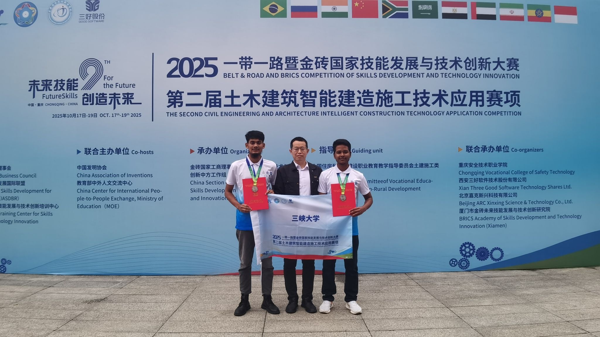 (通讯员 陈兴华)近日,我院2023级土木工程专业孟加拉国留学生SAJIB MD SAJIBUR RAHMAN(中文名:刘涵)、MIA MD MASUM(中文名:孟森)组成的国际团队,作为本次赛事唯一一组留学生队伍,在2025“一带一路”暨金砖国家技能发展与技术创新大赛之第二届土木建筑智能建造施工技术应用赛项全国总决赛中,与297支中国院校队伍的学生同台竞技、同场比拼,最终凭借扎实的专业能力与稳定的赛场发挥斩获二等奖(银牌),再次展现学院留学生风采。