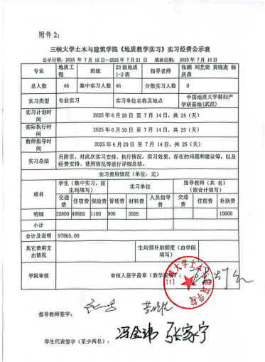 三峡大学土木与建筑学院23级地质工程本科生《地质教学实习》实习经费公示表
