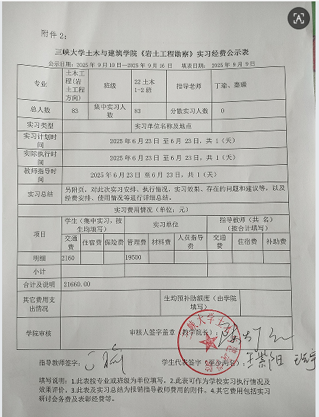 三峡大学土木与建筑学院《岩土工程勘察》实习经费公示表