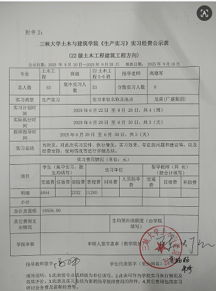 三峡大学土木与建筑学院《生产实习》(建工方向)实习经费公示表
