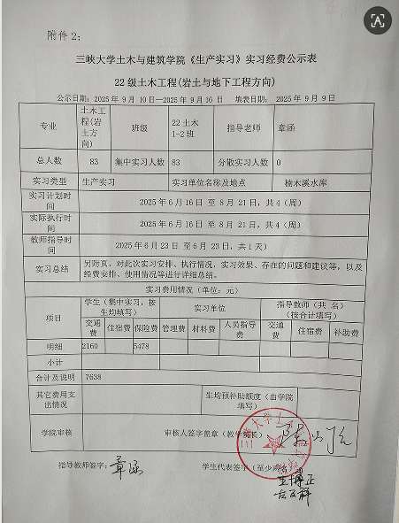 三峡大学土木与建筑学院《生产实习》(岩土方向)实习经费公示表