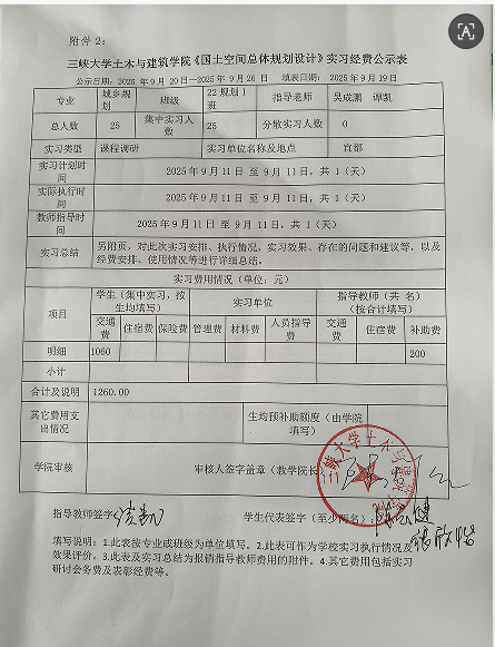 三峡大学土木与建筑学院《国土空间总体规划设计》实习经费公示表