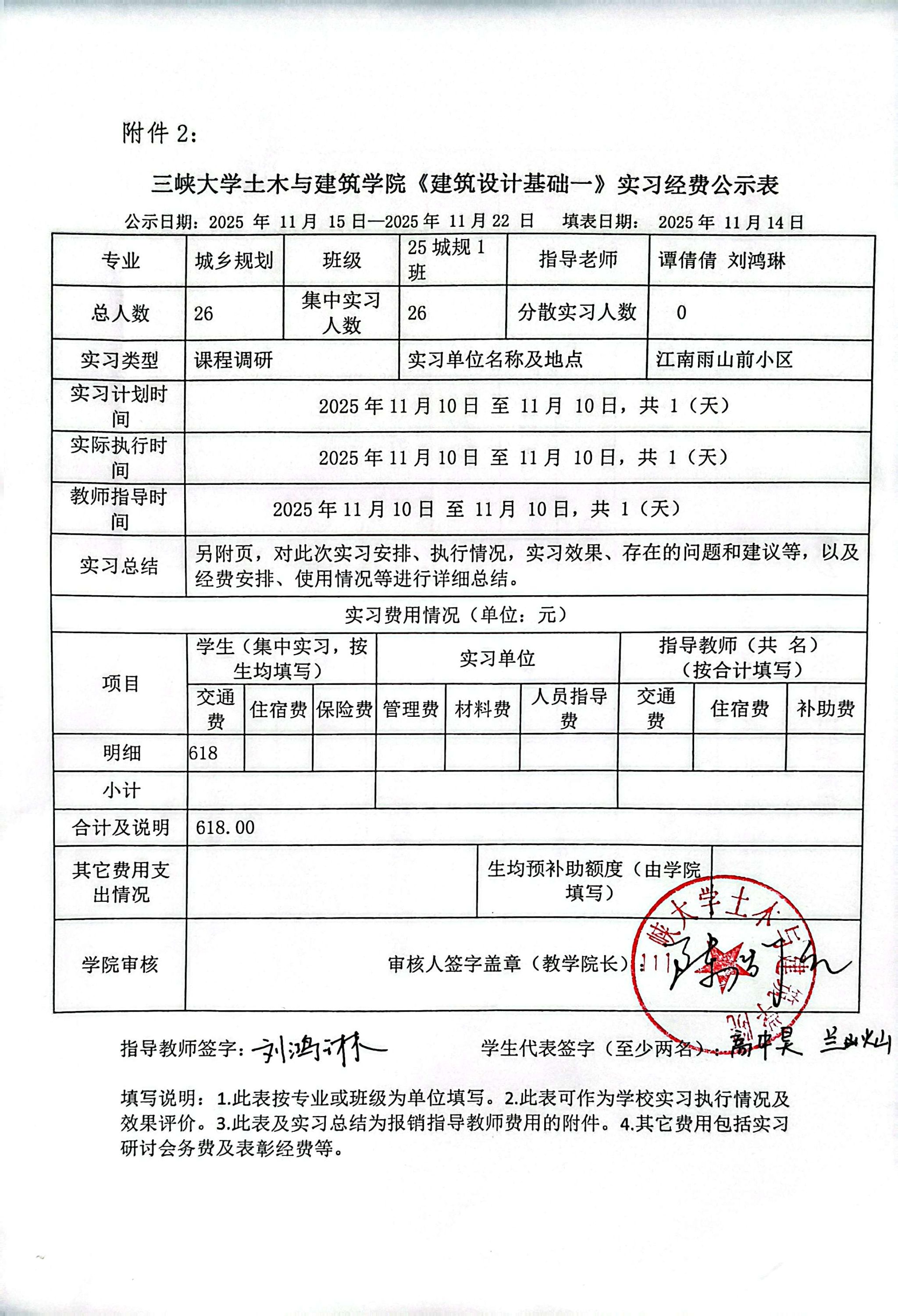 三峡大学土木与建筑学院《建筑设计基础一》实习经费公示表
