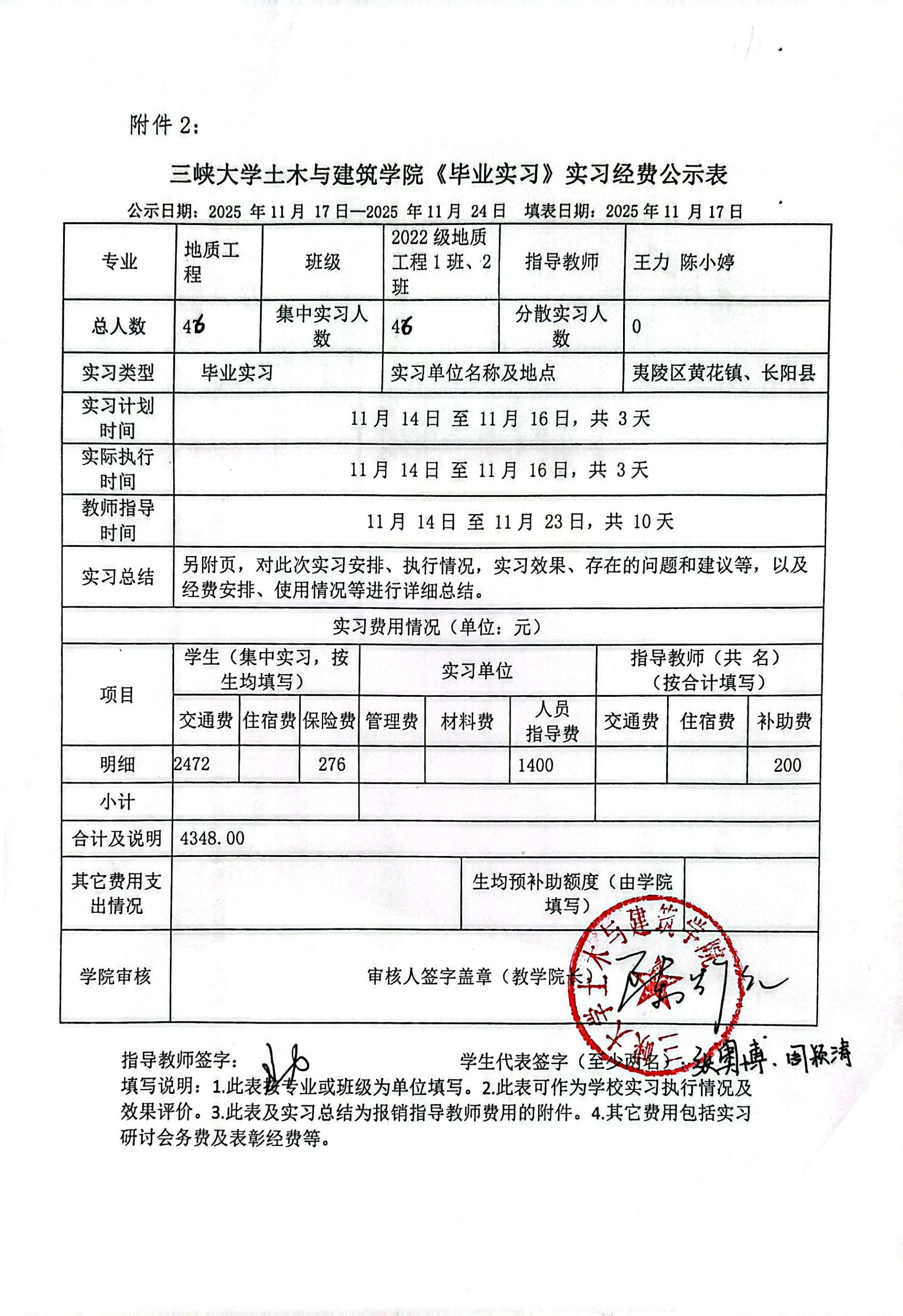 三峡大学土木与建筑学院地质工程《毕业实习》实习经费公示表