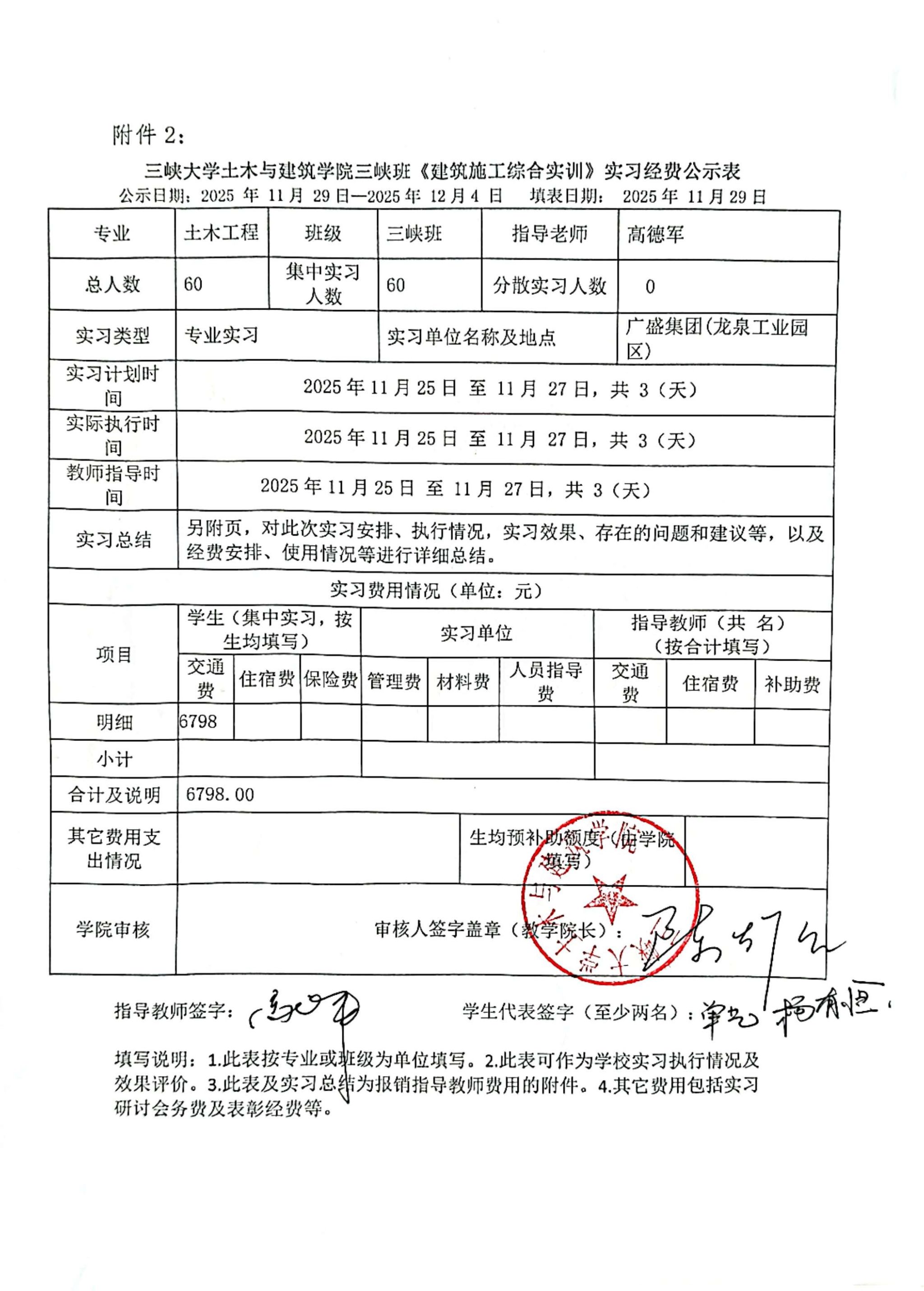 三峡大学土木与建筑学院三峡班《建筑施工综合实训》实习经费公示表