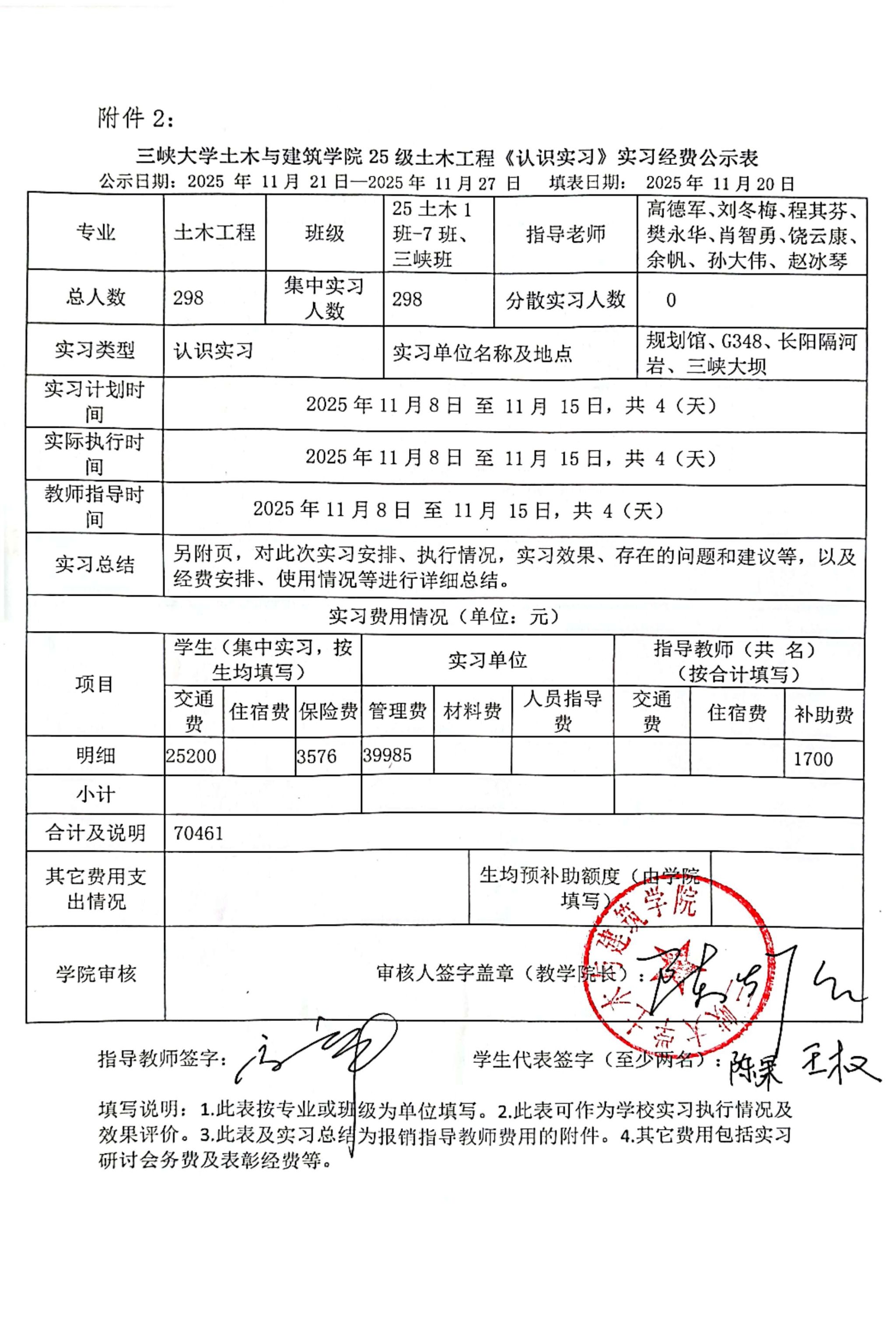 三峡大学土木与建筑学院建筑学25级土木工程《认识实习》实习经费公示表