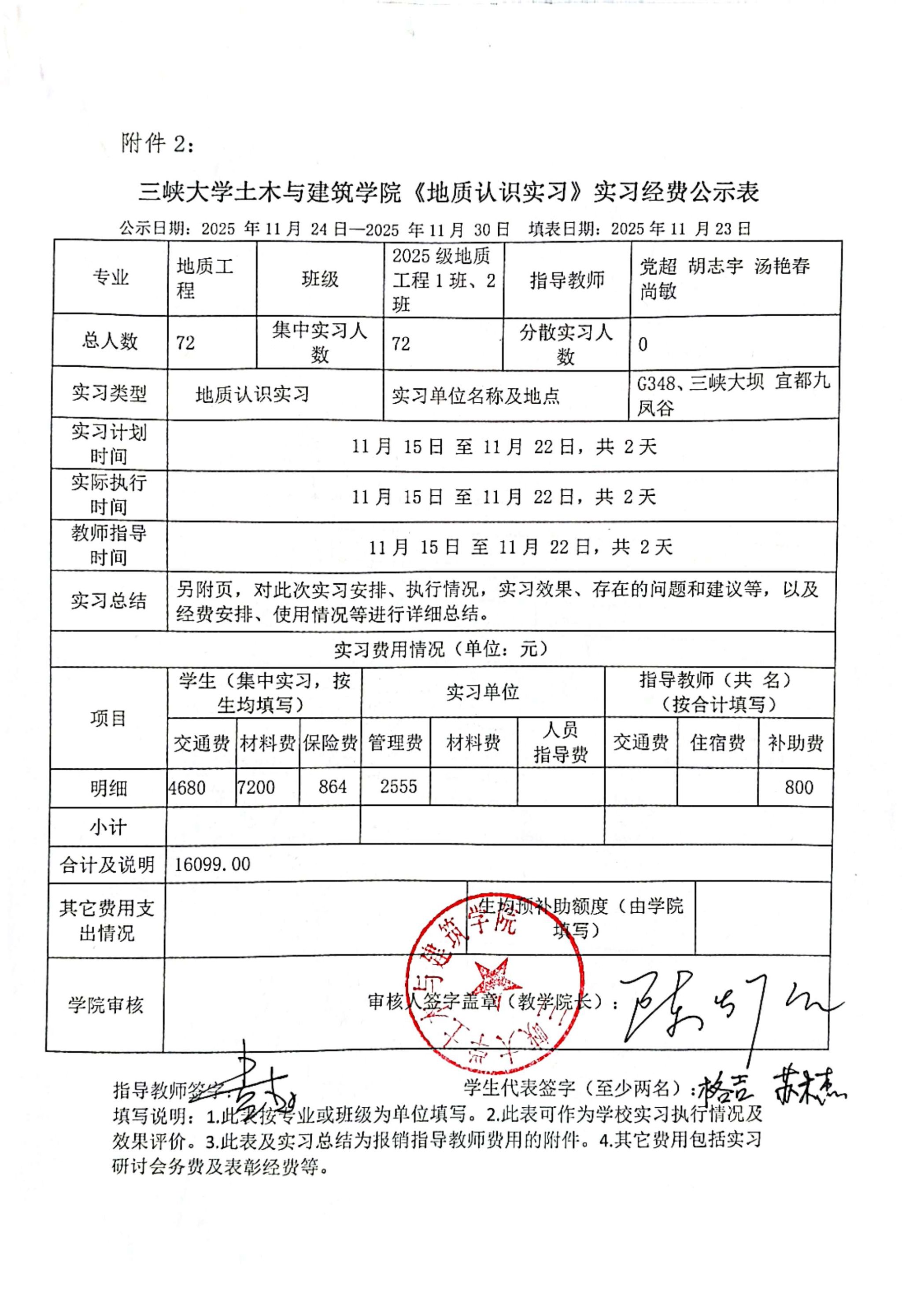 三峡大学土木与建筑学院《地质认识实习》实习经费公示表
