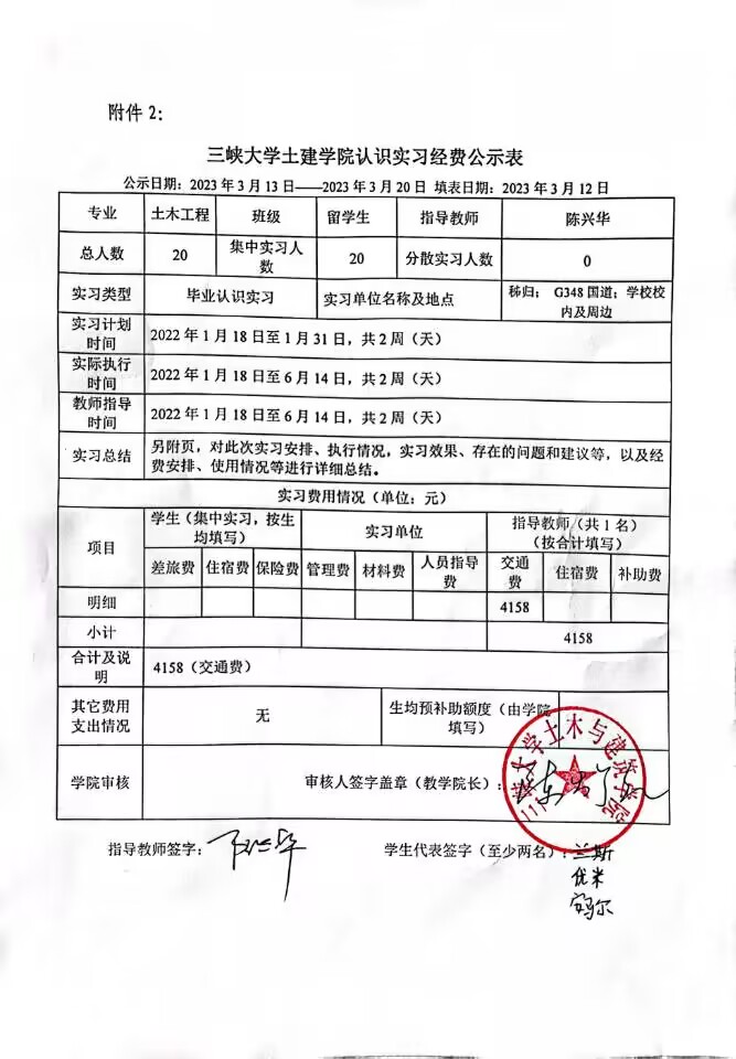 土建学院留学生认识实习经费公示表
