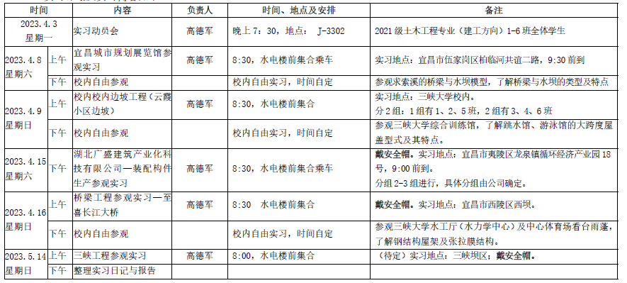 3、实习采用“集中+分散”相结合方式。每天集中实习半天,实习地点统一安排;分散实习由学生自主在校内参观半天,主要参观校内的各类已建建筑、求索溪的桥梁与水坝模型、及校内的边坡工程。