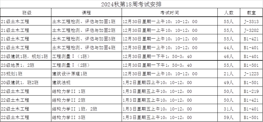 2024年秋季学期第十八周考试安排