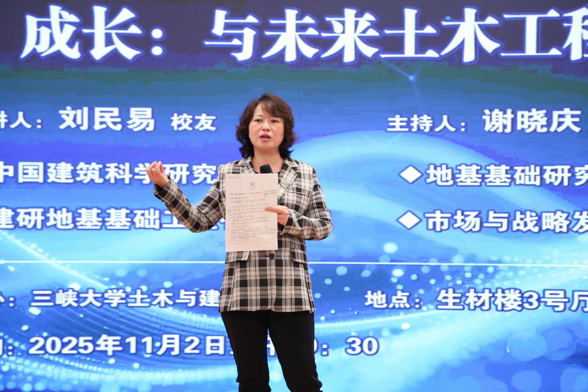 11月2日上午,三峡大学土木与建筑学院“引航人生”师长谈第十一期——筑梦.成长:与未来土木工程师的对话讲座在生材楼3号厅顺利举行,学院全体新生齐聚现场,学院党委副书记谢晓庆担任主持,中国建筑科学研究院建研地基基础工程有限公司总监、土建学院92届校友刘民易应邀主讲。