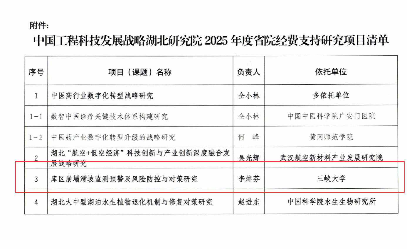 近日,2025年度中国工程科技发展战略湖北研究院咨询研究项目立项名单正式公布,李焯芬院士负责的“库区崩塌滑坡监测预警及风险防控与对策研究”成功获批2025年度中国工程院院地合作重点项目,实现了我校在该项目领域零的突破。